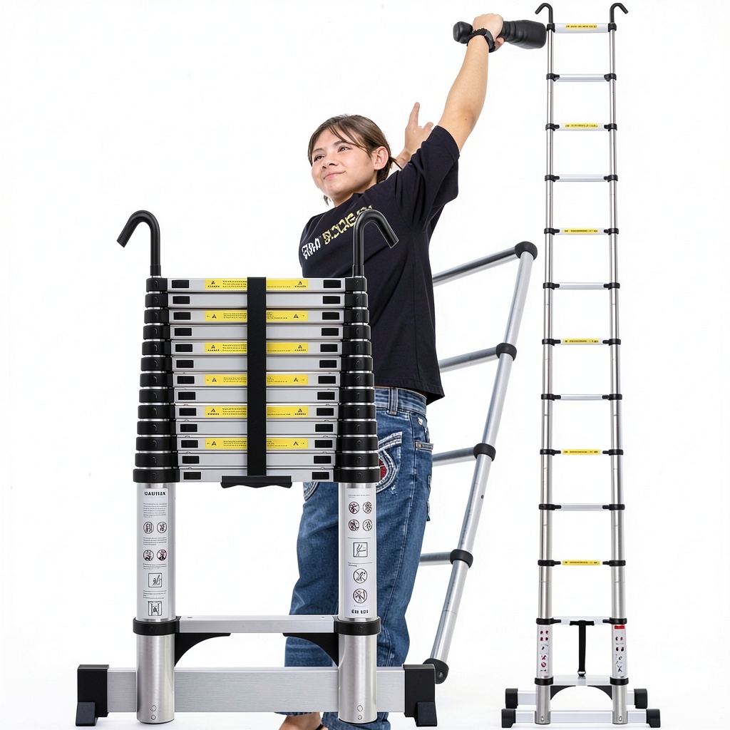 This telescoping ladder is designed for a wide range of environments, including home interiors, exteriors, and recreational vehicles. It is ideal for tasks such as painting walls, repairing roofs, maintaining buildings, changing lights, or accessing attics and RVs. The target audience includes homeowners, contractors, and DIY enthusiasts who need a versatile, space-saving ladder for occasional or frequent use. Its portability allows for easy transport to job sites, while the secure locking mechanism ensures safety during operation in diverse settings.