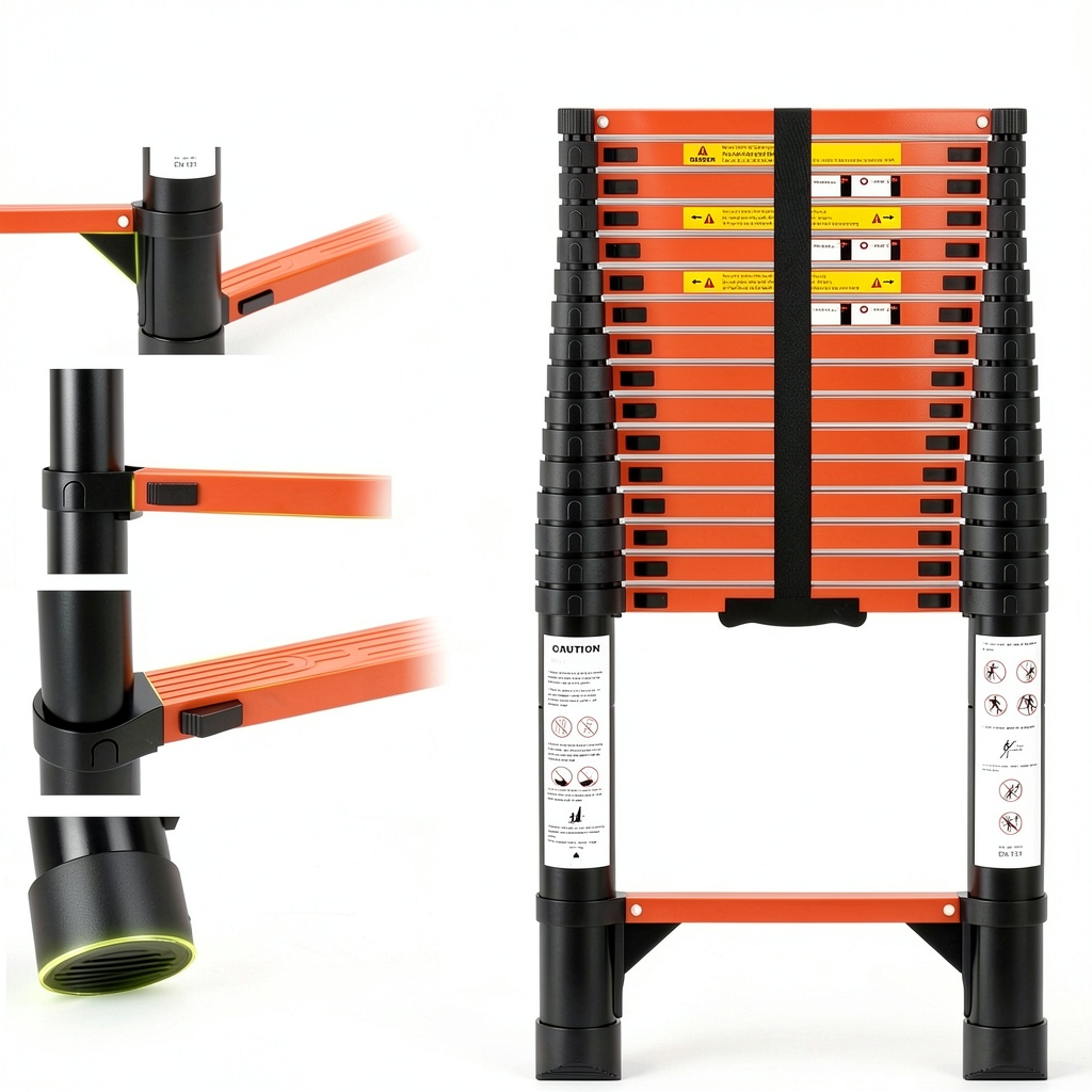 Engineered for superior stability and safety, the DIAMONDFORGE telescoping ladder is crafted from high-strength aluminum alloy, ensuring durability and lightweight portability. It features smart locking pins and anti-slip steps, with a maximum height of 38.98 inches and a robust load capacity of 330 pounds. This EN131-certified ladder includes 17 steps and is available in multiple sizes, such as 8.5 FT, 10.5 FT, 12.5 FT, and 16.5 FT, all in a vibrant orange color for high visibility. Weighing just 25.3 pounds, it combines advanced fiber-reinforced plastics for enhanced strength and weather resistance, making it a dependable tool for various applications.