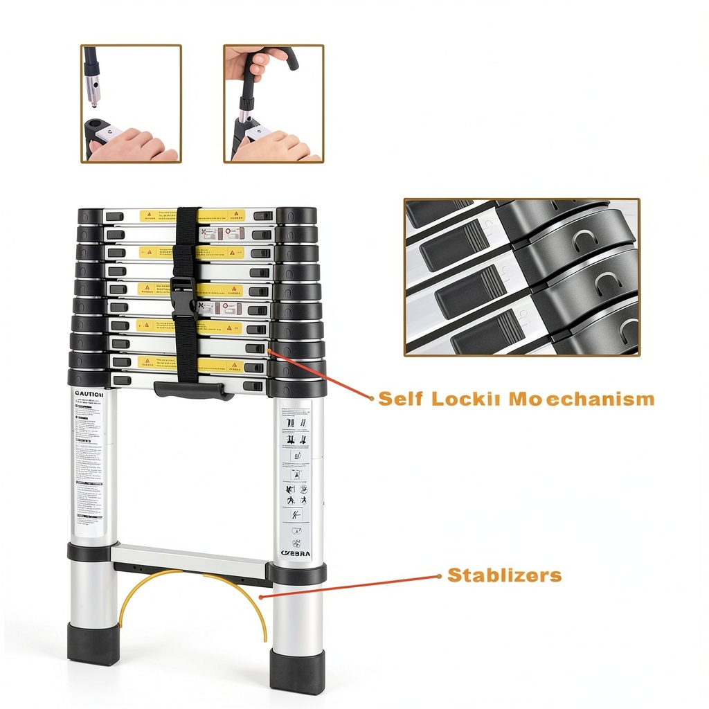The KZEBRA telescoping ladder is built from high-quality aluminum alloy, providing durability and resistance to wear and corrosion. It features a secure locking system, anti-slip rubber feet, and a 330-pound load capacity for safe indoor and outdoor use. Compact and portable, it easily stores in tight spaces like car trunks or under beds, making it perfect for home repairs, RV travel, and professional tasks.